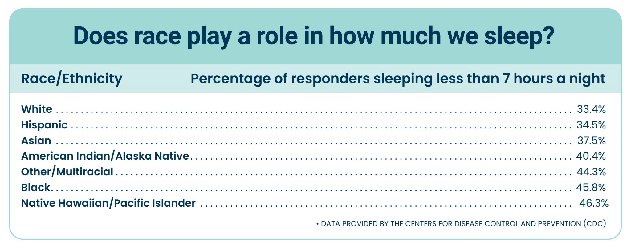 As shown in the table below, Black Americans, Native Hawaiian/Pacific Islander, and multiracial Americans are most severely affected by a lack of sleep, with nearly 50% of each reportedly sleeping less than 7 hours a night (CDC, 2023).