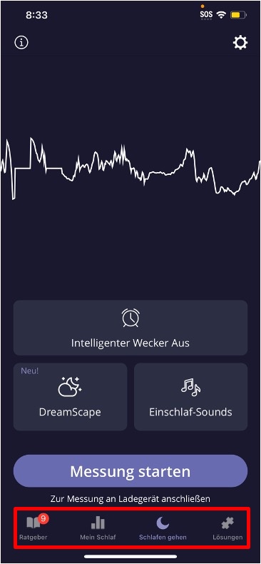 Deine Schlaf-Reise beginnt hier! Verwende das Hauptmenü um dich durch die verschiedenen Bereiche der App zu bewegen. Diese Bereiche geben dir mehr Kontrolle über deine Schlafgewohnheiten und liefern dir Erkenntnisse zu deinem Schlaf. Von der Messung deines Schlafs bis hin zu Verbesserungslösungen – mit der Navigation findest Du jederzeit das, was du für einen gesunden Schlaf brauchst.