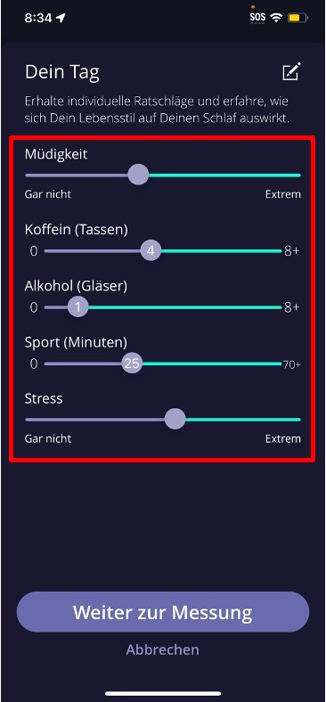 Auf dem Bildschirm für deine tägliche Reflexion “Dein Tag” protokollierst du deine Tagesaktivitäten, indem du über die Balken streichst. Dies hilft uns, deinen Lebensstil zu verstehen und das Schlafcoaching speziell auf dich zuzuschneiden. Jede Angabe von dir trägt zur weiteren Personalisierung des Programms bei und stellt sicher, dass die Ratschläge genau auf deine Bedürfnisse zugeschnitten sind.