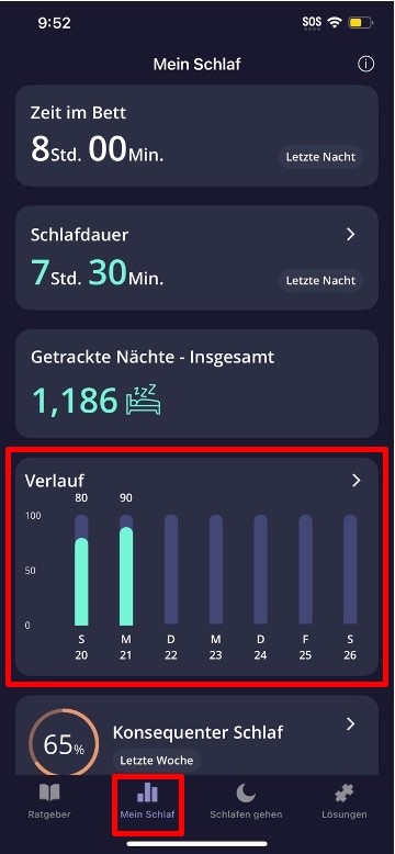Um deine Daten nach einer aufgezeichneten Nacht anzuzeigen, klicke auf “Mein Schlaf” auf dem Bildschirm. Hier erhältst Du detaillierte Einblicke in deinen Schlaf und erkennst Muster und Trends im Laufe der Zeit. Die SleepScore-Historie hilft dir deine Fortschritte der vergangenen Wochen oder Monate zu sehen.