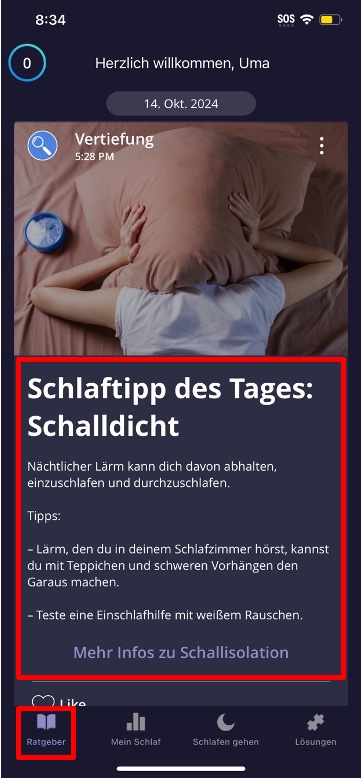 Der “Ratgeber“ ist dein persönlicher Schlafcoach. Nach jeder Schlafaufzeichnung erhältst du personalisierte Ratschläge, Tipps und Erkenntnisse, die auf deinen individuellen Schlafmustern basieren. Diese Funktion hilft dir deine Routinen und Gewohnheiten richtig anzupassen und führt dich mit der Zeit zu einem besseren Schlaf.
