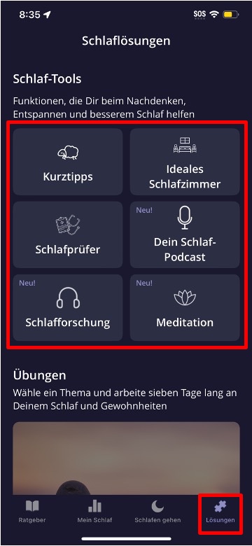 Du brauchst schnelle Unterstützung? Der Bereich “Schlaf-Tools“ bietet jederzeit On-Demand-Funktionen und Lösungen, die deinen Schlaf unterstützen. Ganz gleich, ob du nach entspannenden Audioanleitungen oder Expertentipps suchst, diese Schlaf-Tools unterstützen deine Reise zur Verbesserung deines Schlafs.