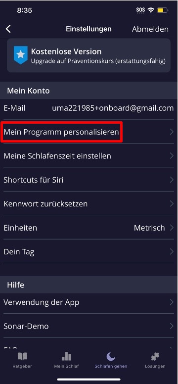Möchtest du deinen Schlaf auf die nächste Stufe heben? In den Einstellungen kannst du mit der Option „Mein Programm personalisieren“ einige weitere Fragen beantworten, um dein Programm zur Schlafverbesserung weiter zu personalisieren. Je mehr wir über dich wissen, desto besser können wir dich beraten!