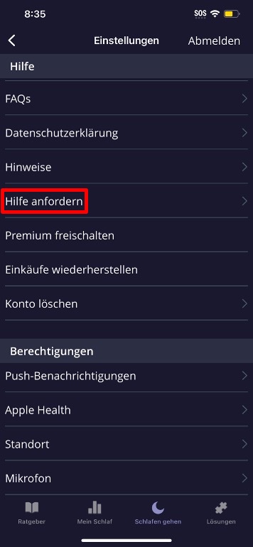 Wir sind für dich da. Wenn du Probleme mit der Schlafmessung hast, kannst du über die Option „Hilfe anfordern“ ganz einfach die Kundenbetreuung kontaktieren. Sende eine Protokolldatei mit nur einem Fingertipp und unser Team wird dir in kürzester Zeit helfen.